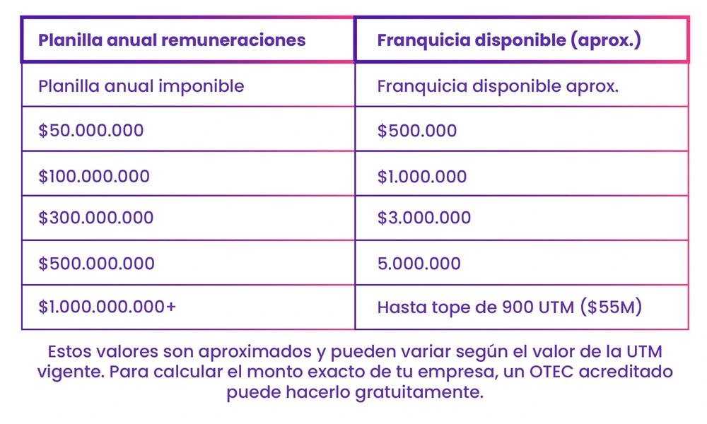 El monto de la Franquicia Tributaria SENCE equivale al 1% de la planilla anual de remuneraciones imponibles de la empresa. Existe un monto mínimo de 9 UTM y un tope máximo de 900 UTM anuales.